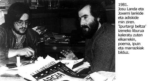 “Oso gaizki ohitu ginen”. Josuren ustea da hori. “Kanpotik ikusita, oso suizida izango ginen. Baina sei urtean lortu genuena izugarria zen. Aldizkaria saneatu, azpiegiturak jarri, proiektuak aurrera atera, euskal prentsa posible eta beharrezko zela aldarrikatu. Joxemik bazekien zein indar zuen taldean, eta atrebitzen da bestela atrebitu ez litzatekeen gauzak planteatzen. Hor badago autoelikatzen den espiral bat. Erronkei heldu egiten genien, baina ez modu egituratuan, modu bitalean baizik”. Joxemik ez zuen sekula ni hitza erabiltzen: beti zen gu. “Egin behar dugu” eta “egingo dugu”. Bazekien amets egiten, baina baita indarrak neurtzen ere, eta gutxitan emango zuen urrats ustelik. Ipurtargi beltzaren irudia asmatu zuten Joxemik eta Josuk elkarrekin kaleratu zuten libururako. Joxemi ipurtargi batekin pareka daiteke, baina ez beltza. Eta alegia berri baten hasera osatzen hasi: bazen behin eguzki batek baino argi txikiagoa eginagatik, itzal luzeagoa ematen zuen ipurtargi bat...