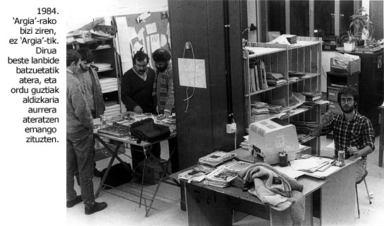 Egia auzoko Karmengo Amaren lokal berrira urte bukaeran egin zuten. Begiratu irudiari: lokala baxu bat da, iluna. Leihorik ez du, egunkariak hormaren kontra pilatuta. Mahaiak paperez josita. Goizean bazoaz, ez da harritzekoa izango Joxemi, Josu eta Iñaki ordenagailuen gainean lo topatzea, gaupasa egin eta gero. Arratsaldean denak izango dira han, eta ez dute aldizkaria bukatu arteko onik izango. Aldameneko Kata tabernan dute bestelako azpiegitura guztia: jatena, edatekoa, kafeak eta tabakoa. Haize piska bat hartzeko lekua. Joxemik jertse gris handia darama soinean; ilea luze, bizarra. Muntatze mahaian lanean ibilita, jertsearen mahuketatik artikulu zutabeen zatiak eta paperak ditu zintzilik. Kafesneek eusten diote esna. Zigarroaren kearekin kontzentratzen da. Lau pintxorekin berdintzen du gosea.