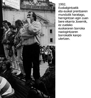 Joxemiren entregaren adierazgarri da hurrengo argazki hau: uztailaren 14a da, gauerdia aspaldi jota, eta Joxemi Argia-ko erredakzioko muntatze mahaian dago, biharamuneko festa erraldoian banatuko den zero alea muntatzen, garai zaharretako lanetara bueltatuta une batez. Aldamenean Ostaizka du, neska-laguna. Baita Argia-ko lankideak eta egunkariaren egitasmora bildu diren asko ere. Gorbata etxean utzi du, eta betiko Joxemiren itxura du. Barrez ari da, txantxak egiten, kuterrarekin orrialde bat muntatzen ari den bitartean. Egunkariaren lehen ale hura goizalderako kalean izango zela ikusteak zer gogoeta, zer sentimendu eragin ote zizkion?