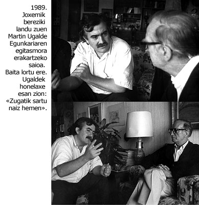 Martin Ugalderi eman zion artikuluaren berri, euskaltzaleek Arregiren dimisioa eskatzeko nahiko arrazoi bazela pentsatuta. Ugaldek ondo ezagutzen zuen Arregiren jarrera, bilera askotan Joxemirekin batera izana baitzen harekin. Horietako bat biziki gogorra izan zen. Horrela gogoratzen du Ugaldek: “Gure diru guztiak nondik nora atereak ziren ikus zezan, Egunkariako sos kontuen paper guztiak erakutsi genizkion. Eta gurekin lan egiteko esan genion, berdin Kontseiluan, berdin bere langileak lanean jarrita”. Hurrengo bilera baterako geratu ziren. Arregik ez zuen kexarik izan proposamenaren inguruan, baina laguntza ukatu zien. “Badakit Arregi harrituta geratuko zela paper haiek aztertuta, zein garbi eginda zeuden, teknikoki zein prestatuta. Egiaztatzeko errazak. Arregik ez zigun kexa zehatzik azaldu, ez zigun adierazi zer iruditzen zitzaion gaizki, mamuak zekusala esan zigun. Gerra garaia eta Francoren pean nahikoa adituta nago gorriak ginela eta halakoak. ‘Nahikoa da’ esan nuen nik, ‘ez zait mamu gehiago golkoan sartzen’”. Ugaldeak bileratik hanka egin zuen, eta han geratu ziren Joxemi eta Joan Mari Torrealdai Arregiren aurrean berunezko isiltasun baten pean. ‘Arregik kontrolatzen ez duen ezer ez du onartzen’, idatzi zuen Joxemik amaitu gabe utzi zuen artikuluan.