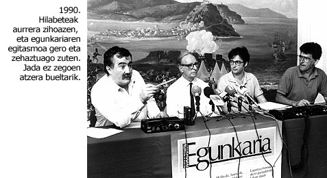 Aurretik beste saio bat ere izan zen, gainera. Eusko Jaurlaritzak 1986an pauso herabe batzuk eman zituen egunkariaren bidean. Euskarazko asteburuko egunkariei diru laguntzak emateko deialdia egin zuen. Baldintzak, nagusiki, bi ziren: astean behin ateratzea eta egunkarigintzatik sortua izatea. Astekarigintza ez zuen kontuan hartzen. Baina, hala ere, Argia-k aurkeztu zuen berea. Eta, horrez gainera, Egin-ek Hemen eta Deia-k Eguna jarri zituzten mahai gainean. Jakina denez, azken biak lagundu zituen Jaurlaritzak, eta Argia-rena atzera bota zuen, aintzakotzat hartu gabe. Hemen eta Eguna egunkari formatuko astekari bilakatu ziren, eta Argia-rentzat lehia desleial nabarmena izan zitekeela ematen bazuen ere, aldizkariak ez zuen minik hartu, eta, gainera, diru laguntza bukatu zen egunean desagertu ziren. Ez zuen, beraz, esperientzia horrek emaitza handirik eman euskarazko egunkari baten bidean. Argia-k aurkeztu zuen proiektua Joxemik idatzi zuen, hain luzaz eta hainbestetan taldean hitz egindakoa jasoz. Ez zuen etsi nahi izan, atzera bota zutenean. Esperientzia hartatik irakaspena ateratzen asmatu zuen, eta egitasmoa eraldatu egin zuen, baina helburua bera zuen: euskarazko egunkaria.