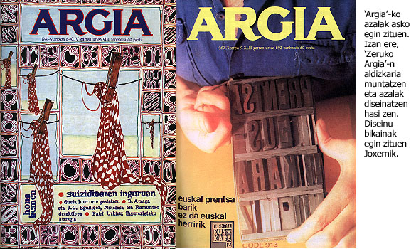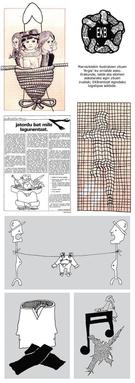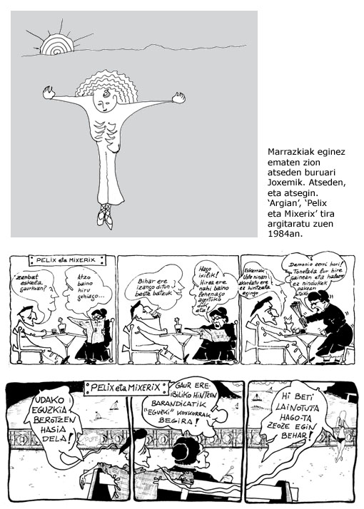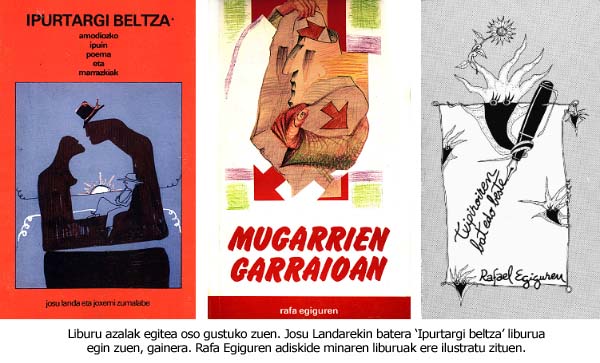 Marrazkiak egitearekin konformatu behar. Marrazkiak eginez hartzen zuen atseden, eta atsegin. Une oro marrazkiak egiten ari zen, mantelean, koadernoetan, txostenetan, eskemetan, paperezko ezpain zapietan. Beti bolaluma eskuetan, eta ezin eskuak geldi eduki. Bazkaritan ere paperezko mantelean marraztuko zuen hitz egiten ari ziren gaiari zegokion eskema; ondo apaindua, gainera, marrazkiekin. Bazkaltzen bukatu, mantel zatia moztu eta poltsikora. Argia-ko azal asko egin zituen; baita liburu eta diskoetako batzuk ere. Kartelak, collage-ak, logotipoak, ilustrazioak, eskupaperak. Horrelako eskaerei ez zien inoiz ezezkorik esaten. Josu Landarekin batera kaleratu zuen Ipurtargi beltza poesia eta marrazki liburua egin zituen marrazki lanetan kuttunena zuen.